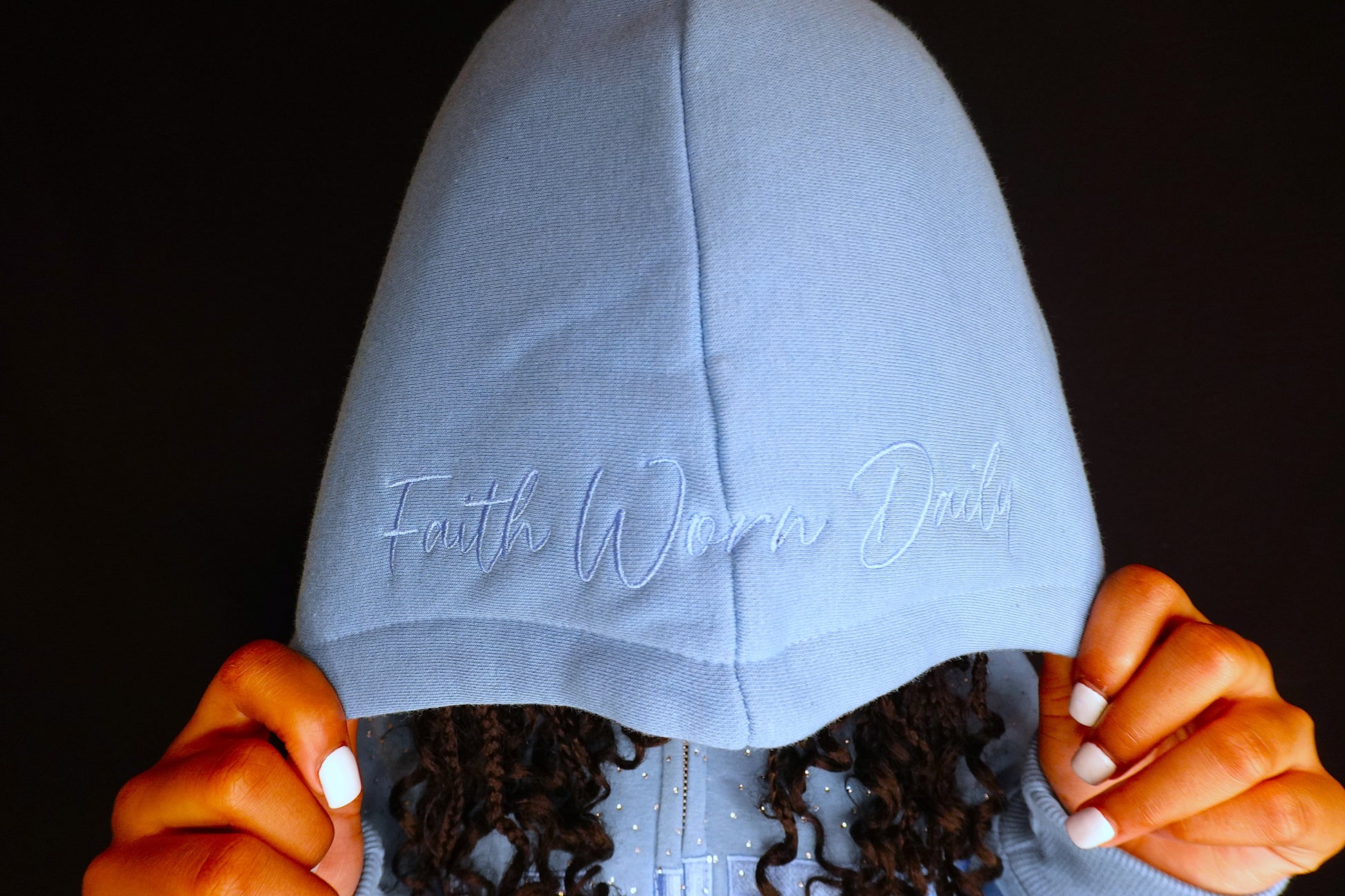 The hood is embroidered with Faith Worn Daily, and the matching joggers complete the statement.